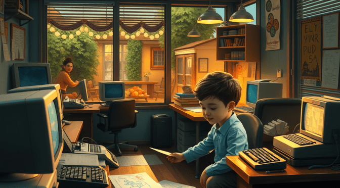 É aquilo: computadores antigos, máquinas de escrever, cheques, poucos funcionários e etc. Eu, às vezes, conversava com os colegas de trabalho e, quando queria passar o tempo, brincava com rascunhos, desenhando, escrevendo, datilografando na máquina de escrever, desenhando no paint e etc. Cheguei a desenhar cheques, escrever histórias e até fazer revistas. Claro, tudo perfeito na cabeça de uma criança.