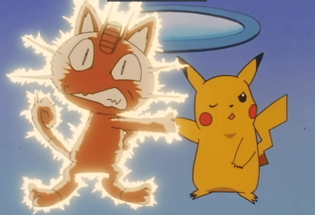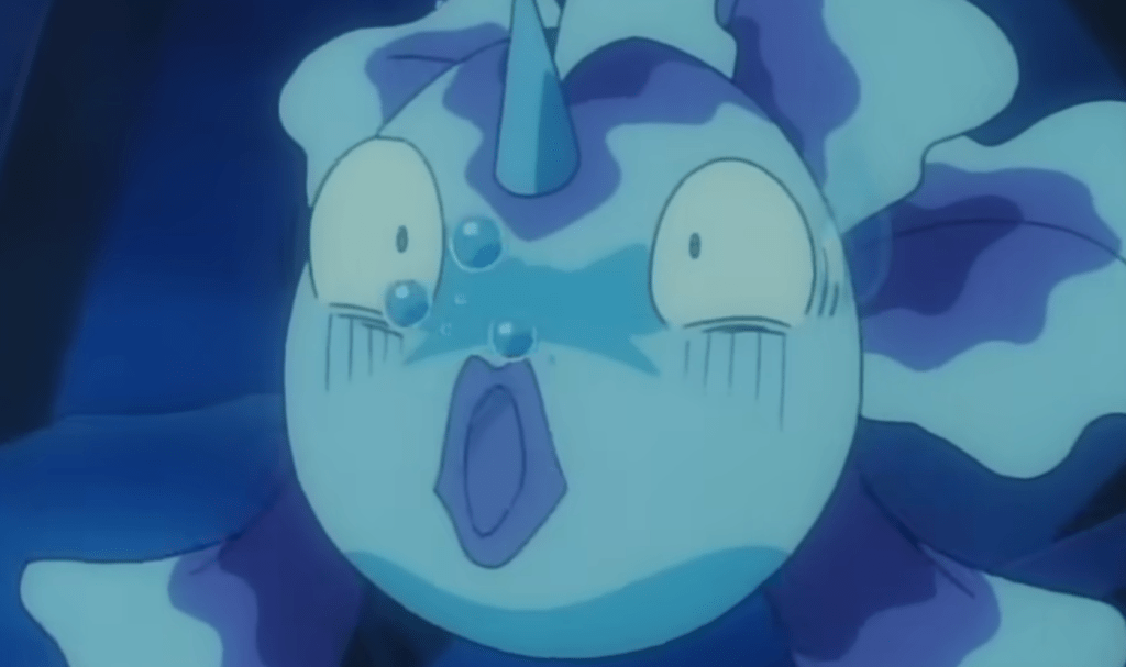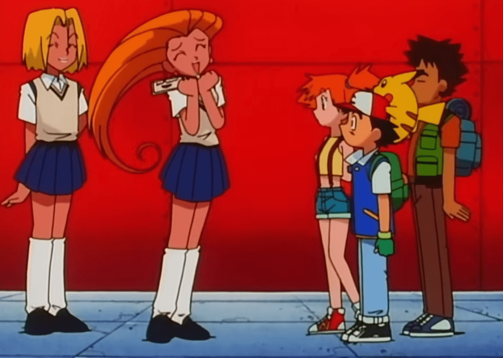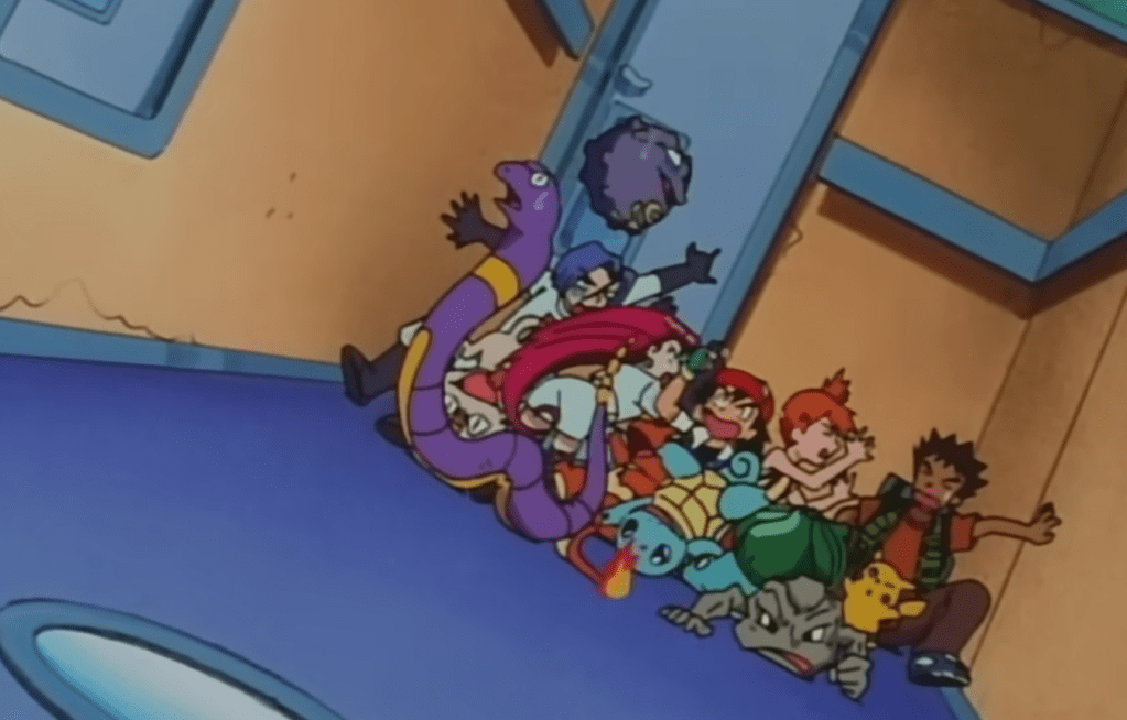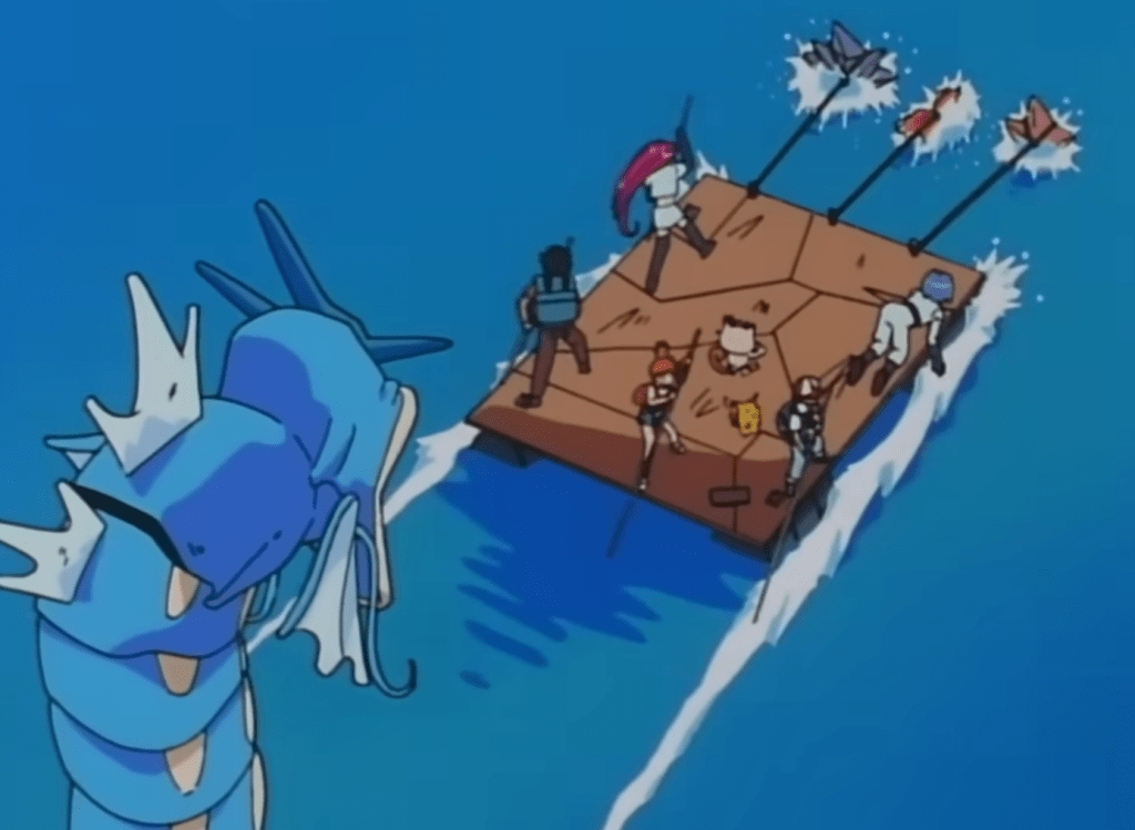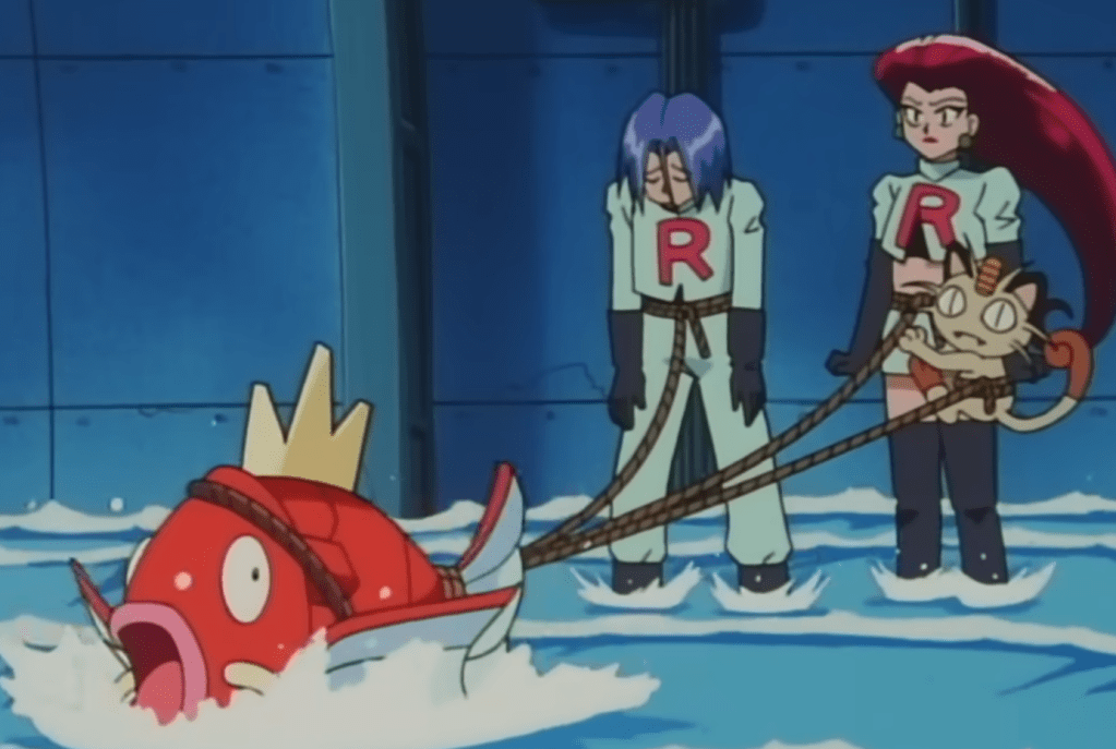 Aí eles abrem um buraco no fundo do navio e saem amarrados num pokémon de água. Porém, a Equipe Rocket não tem nenhum pokémon de água, correto? Errado! James havia comprado um Magikarp que… bom, não serve pra nada.