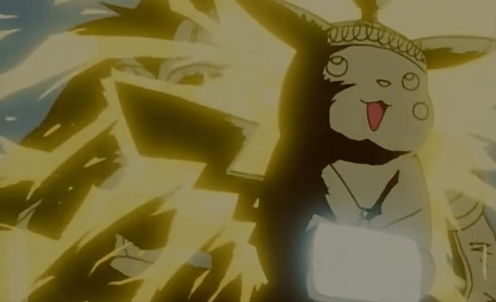 Aí a Equipe Rocket, cita seu lema e informam que tem um novo objetivo de vida: roubar o Pikachu de Ash que, até o momento, era só um pokémon comum e sem graça.