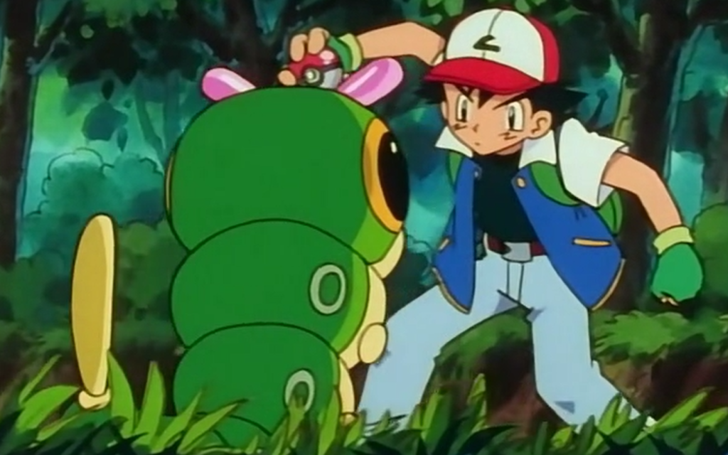 Ash está na floresta de Viridian a caminho de Pewter, quando encontra um Caterpie.