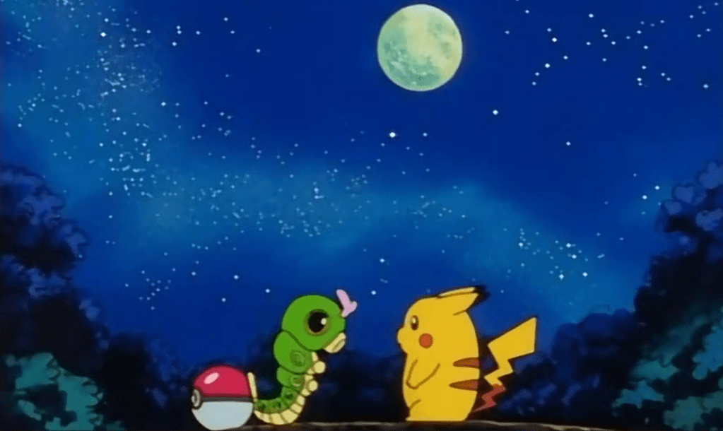 Acho bonitinho que Caterpie conta a Pikachu que seu sonho é poder algum dia voar pelos céus (ou, pelo menos, é o que parece).