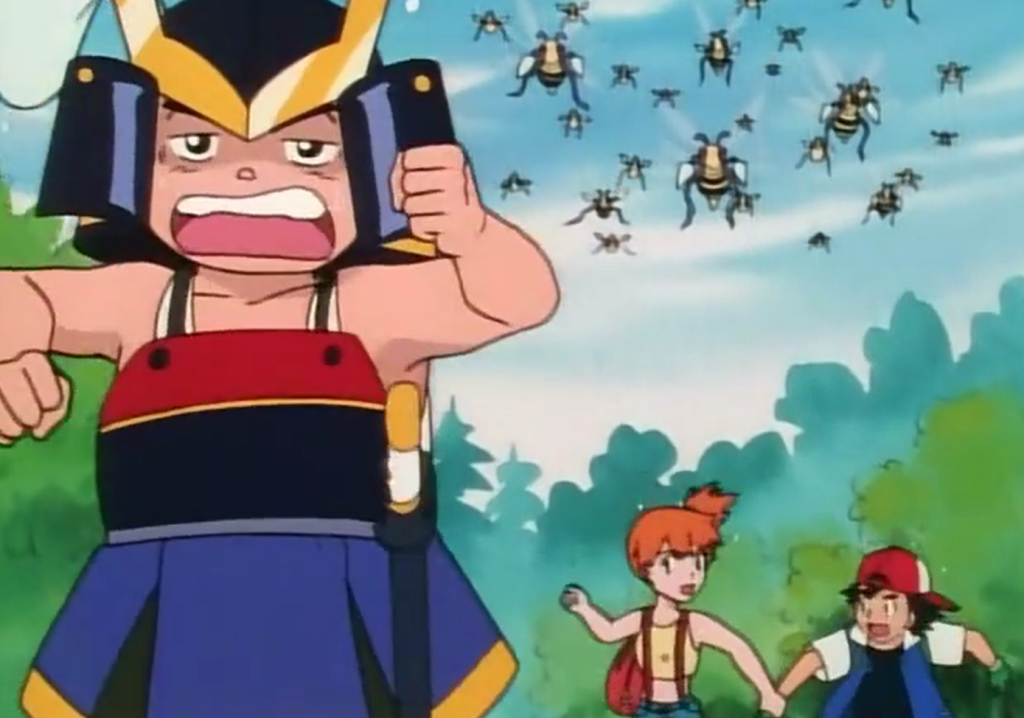 Mais cedo, Ash tinha tentando capturar um Weedle, mas como foi impedido pelo Samurai, o dono do Metapod, ele consegue fugir e a fofoqueira da larva de abelha conta pras outras Beedrills, o que nos permite ver nossos herois correndo para salvar suas vidas.
