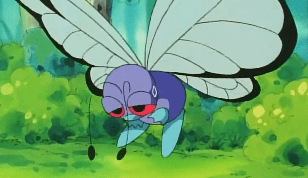 Ash até tenta capturá-lo, mas, por algum motivo, o inseto de Ash, que é mais forte do que pokémon planta, leva uma surra que deixa a própria borboleta de Ash de olhos vermelhos (e pelo branquinho).
