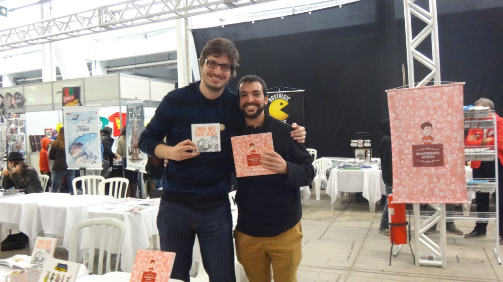Pedro Leite é cartunista e ilustrador de obras como “Quadrinhos ácidos” e “Onde meu gato senta”, que eu comecei a seguir há um tempinho bom desde sua época de Facebook. Comprar um livro dele seria uma coisa, mas ter o prazer de levar sua obra ali autografada na hora após bater um papo sobre sua história enriqueceu bem a minha tarde. O cara é gente fina e só não pareceu ser mais alto por ter dobrado o joelho pra tirar a foto (ele é alto demais ou eu que sou baixinho?)