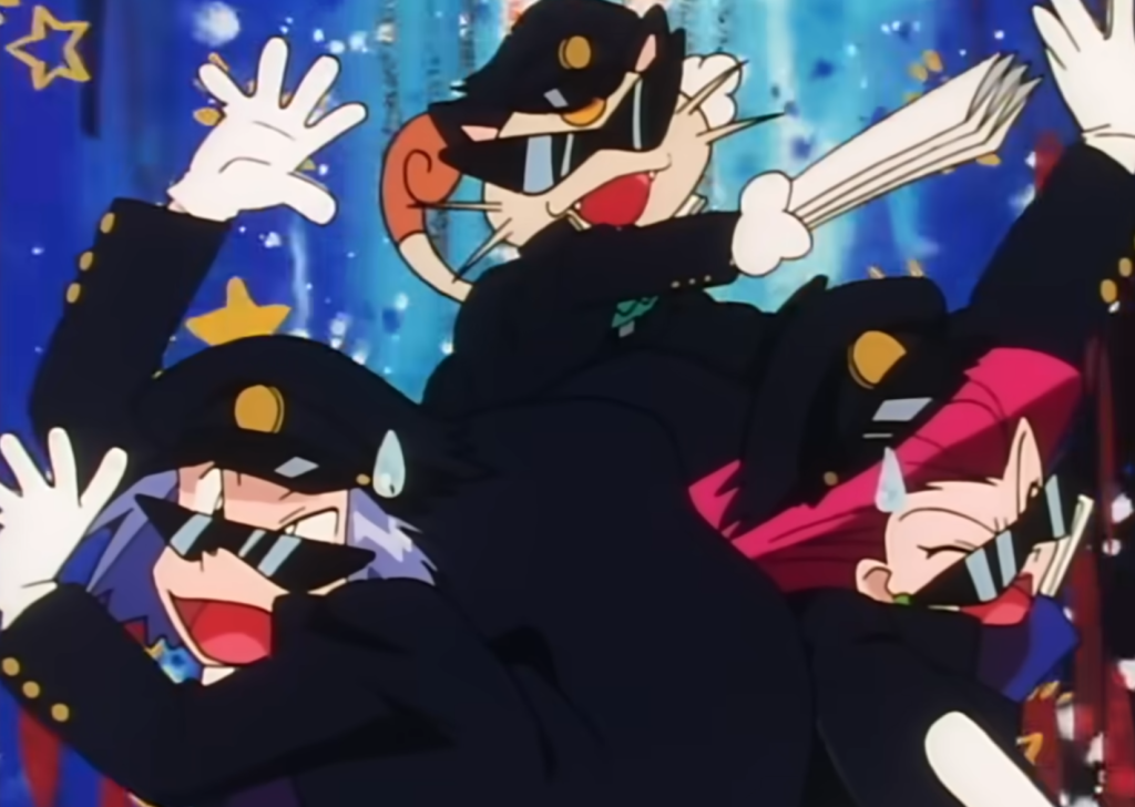 A Equipe Rocket nesse episódio aparece disfarçada para torcer pelo Pikachu. Mas, Misty logo descobre.